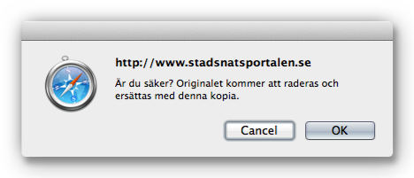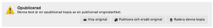 Längst upp i huvudet på kopian finns länkar tillbaka till originalartikeln, samt knappar för att spara och ersätta orginalartikeln eller radera kopian.