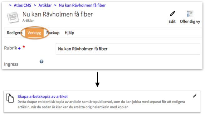 Klicka sen på fliken Verktyg och Skapa arbetskopia av artikel