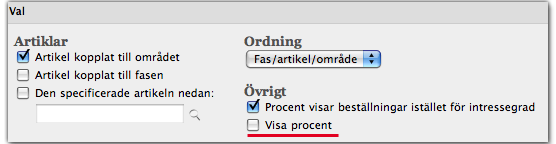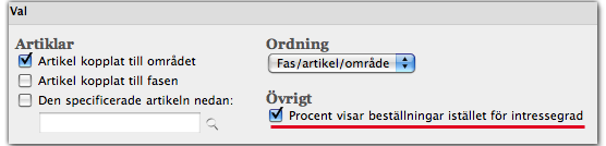 Igår genomfördes en ny funktion som gör att man, per område, kan välja om man vill visa procenten för inkomna beställningar istället för intresse. Detta kunde genomföras enkelt då det är en utbyggd funktionalitet, men att kunna välja vilka faser, eller vilka områden som ska visa procent är en förändrad funktionalitet och då tar vi fram en kravspec på det: