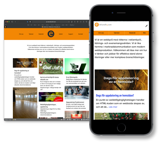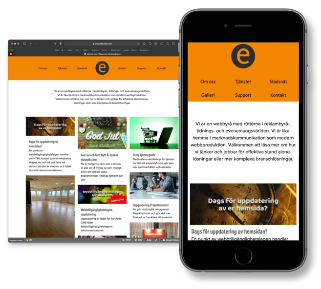 Men samtidigt förstår vi ju att ni vill behålla er identitet även på mobila enheter så givetvis kan vi erbjuda er att skapa en responsiv version som ser ut så som ni vill ha den. Men det kräver i regel lite tänk från er sida med enligt ovan. Vi kan givetvis ta fram en skiss/provlayout till er som ett exempel på en responsiv version av er sida. Hör av er i supportloggen om ni vill diskutera vad detta skulle innebära för er.