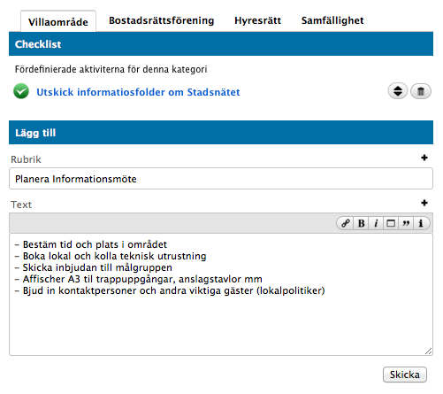 Skriv in aktivitetens namn och en beskrivning över vad som ska göras och klicka på Spara, så läggs aktiviteterna till ovandför i checklistan. Du kan dra dem i önskad ordning och redigera dem i närhelst de behöver ändras.