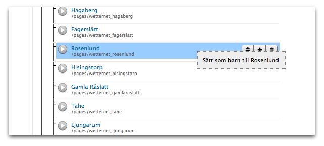 Medan du drar den så får du en hjälptext som förklarar vad som kommer hända när du släpper den. Du ser också en blå markering. Här markeras det att om du släpper posten här så kommer posten lägga sig som ett barn till den markerade posten