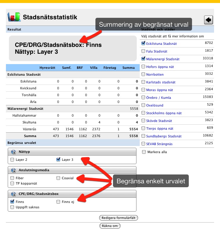 Först väljer men vilka stadsnät man vill se information om