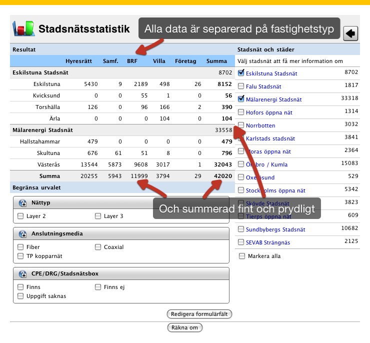 Man får en översikt om uppkopplingar fördelade på stad och fastighetstyp