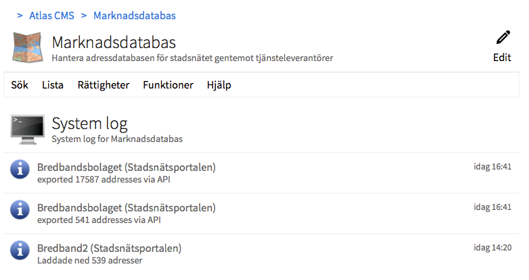 Likadant inne i Admin för en modul så ser ni under funktioner en länk till en systemlog för den modulen.