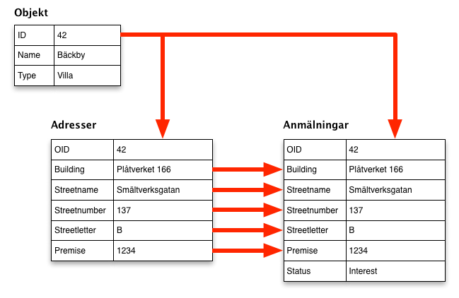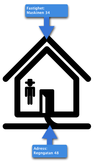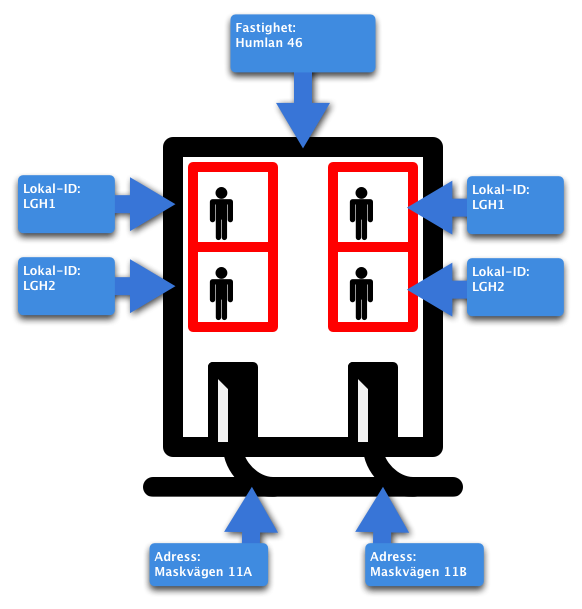 Den unika nyckeln skapas av Fastighetsbeteckning, Gatunamn, Gatunummer, Gatubokstav och Lägenhetsnummer, vilket betyder att antalet anmälningsbara objekt blir varje lägenhet i ett område. Detta är standard för hyresrätter och bostadsrätter. I bilden till höger så har vi en fastighet med två adresser och två lägenheter på varje. Totalt så har vi alltså fyra stycken anmäläningsbara objekt