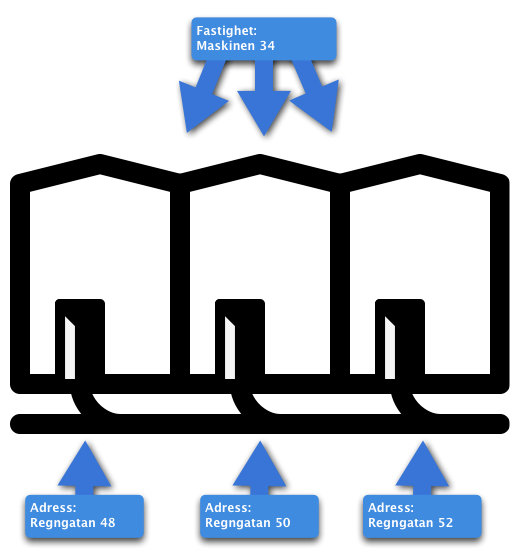 Den unika nyckeln skapas av Fastighetsbeteckning, Gatunamn, Gatunummer och Gatubokstav, så total antalet anmälningsbara objekt är samma som antalet unika adresser. Det betyder att man kan anmäla flera adresser på samma fastighetsbeteckning. Detta kan vara bra för parhus eller liknande lösningar. Bilden till höger visar exempel på ett radhusområde där hela huskroppen har en och samma fastighetsbeteckning och därmed är adressen mer logisk att anmäla på.