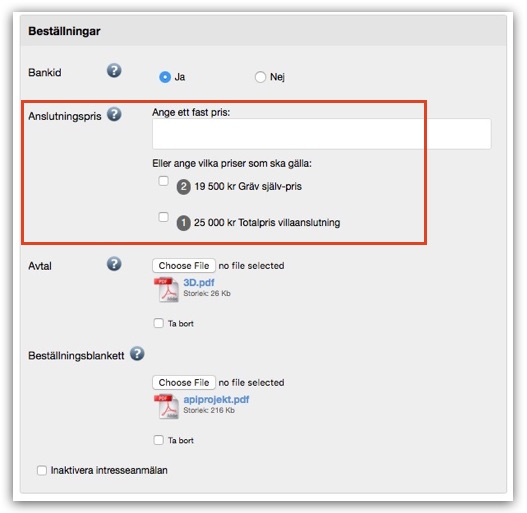 Vissa stadsnät har alternativa priserbjudanden för en villakund. Exempelvis ett grundpris för hela anslutningen och ett lägre pris om villaägaren gråver själv. För att hantera alternativa priserbjudanden har vi skapat en tilläggsmodul i Anslutmotorn som heter Priser, där stadsnätet lokalt kan definiera ett antal prisvarianter i en databas. Modulen hittar du i Admin > Anslutamotorn. Säg till oss via Supportloggen så aktiverar vi modulen i din Anslutamotor.