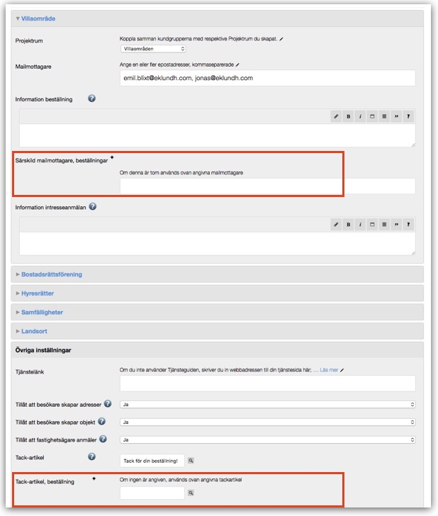 I Anslutamotorns inställningar kan man nu ha olika epostmottagare för intresseanmälan och beställning samt välja olika artiklar som Tack-text när en intresseanmälan eller en beställning gjorts.