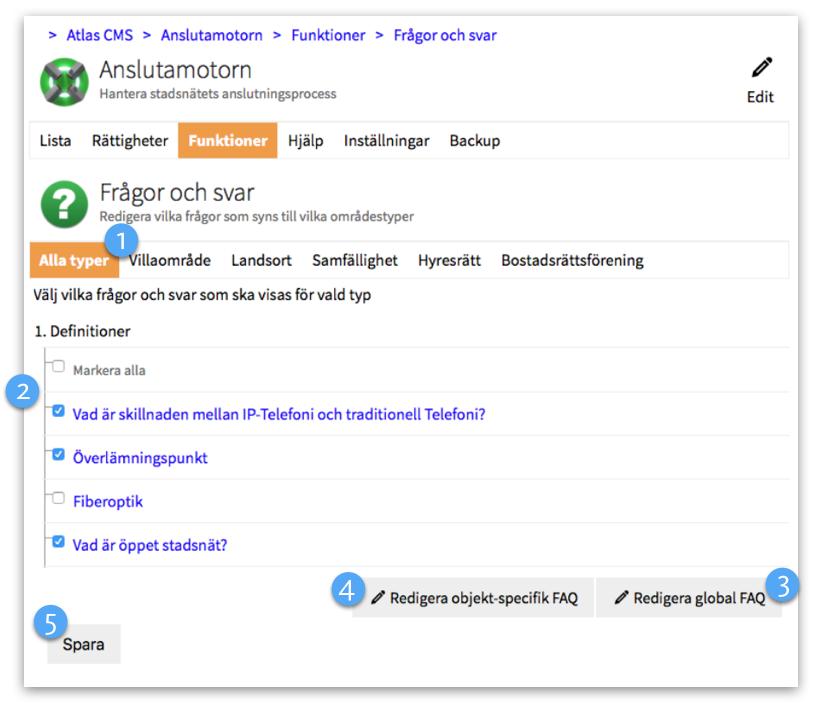 Atlas CMS > Anslutamotorn > fliken Funktioner > Frågor och svar