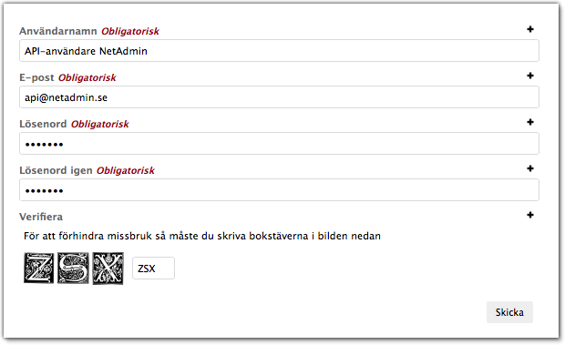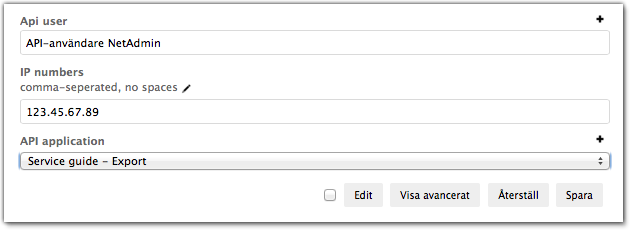 Om ni inte redan har det så måste ni ha en API-användare upplagd i systemet. Skapa en via användarmodulen med de rätta kontaktuppgifterna till den som är tekniskt ansvarig för implementationen, det är via den här kontaktytan nyheter och förändringar kommer annonseras bland annat