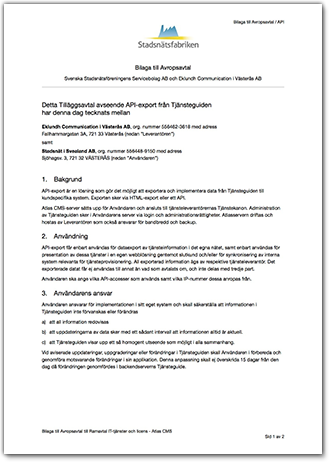 För att använda Export-API:et för tjänsteguiden måste ni teckna avtal med eklundh.com om licens till datat för Tjänsteguiden och hur det får användas.